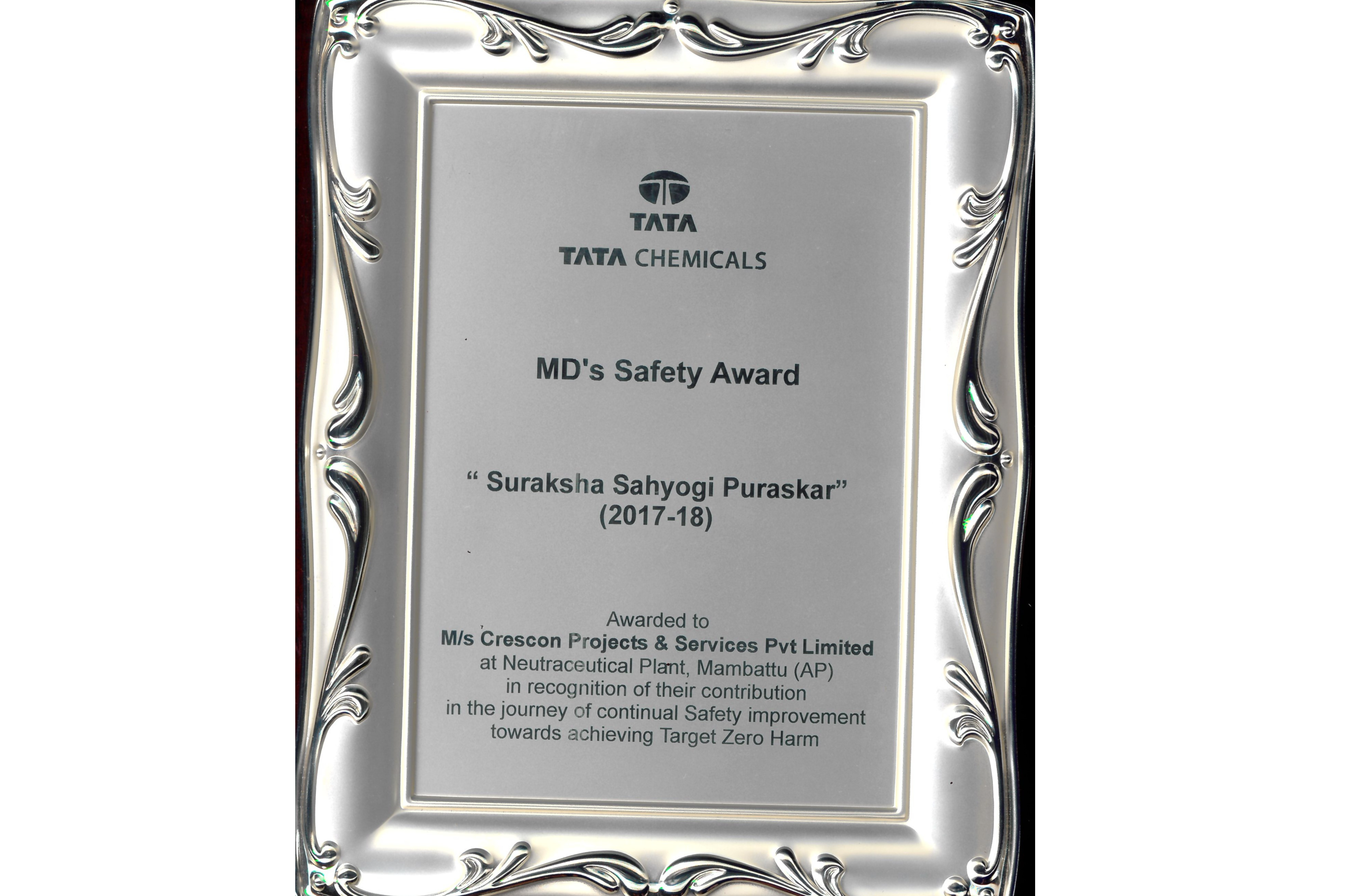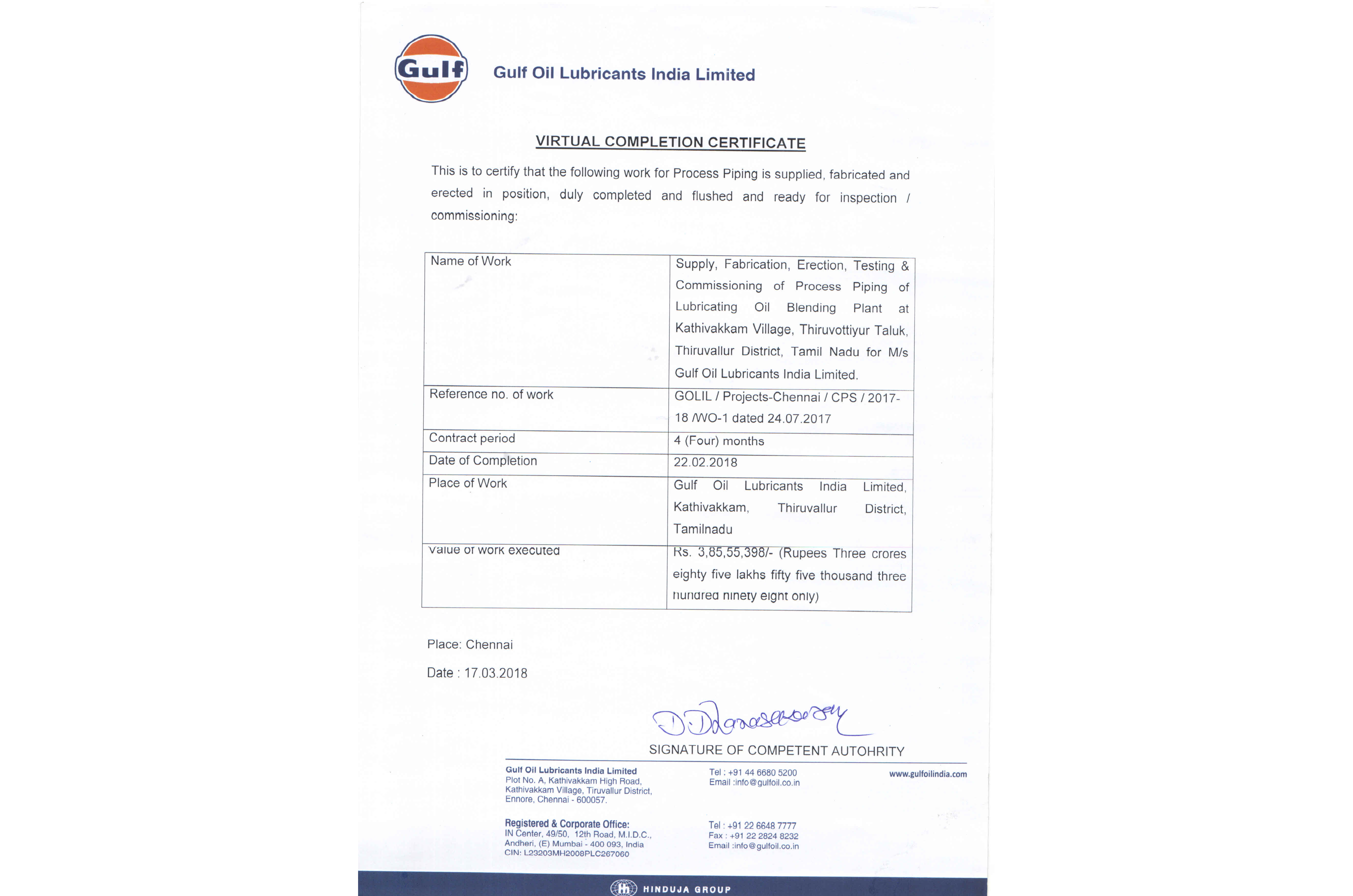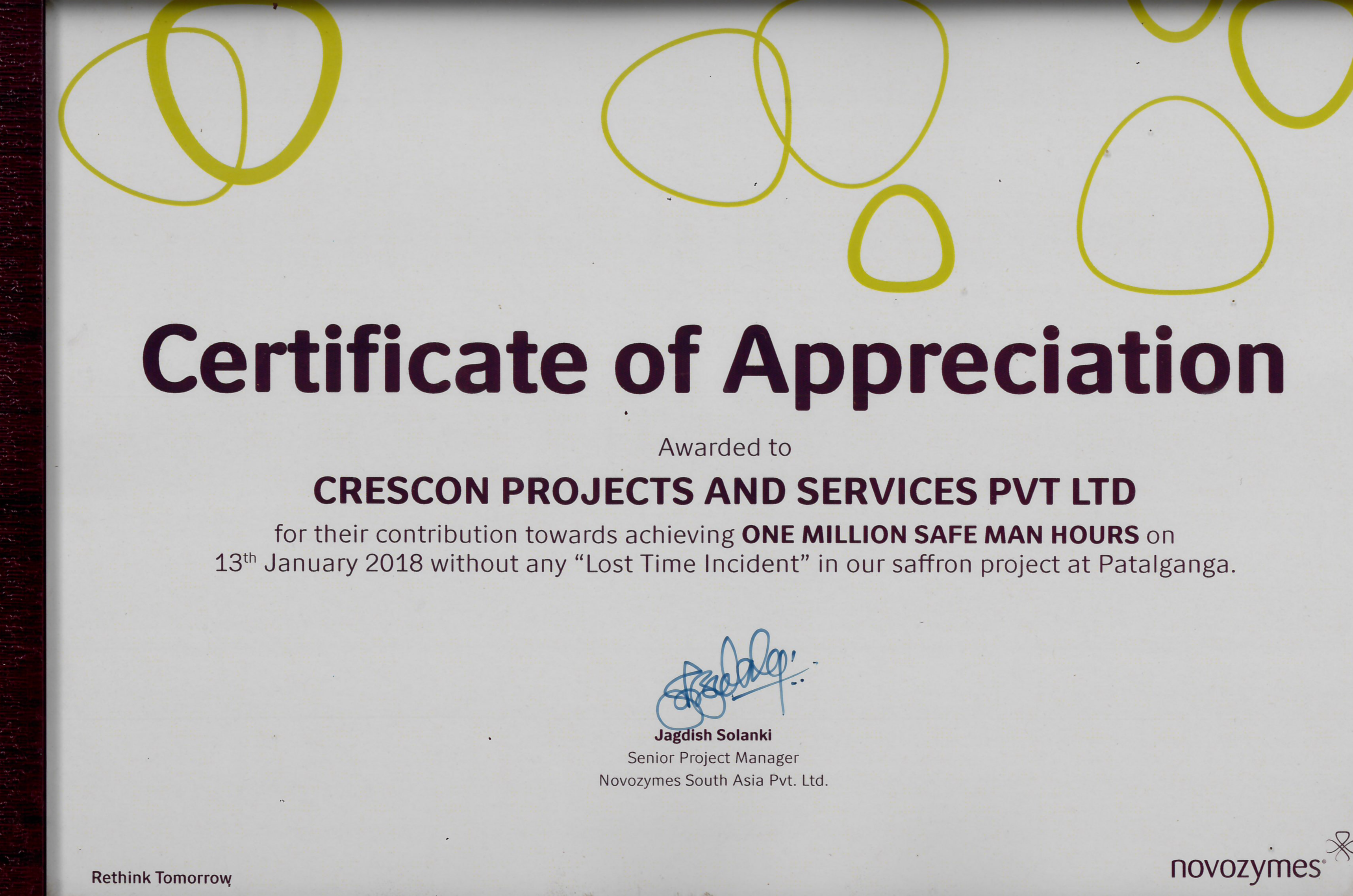Certificate for contribution towards achieving ONE MILLION SAFE MAN HOURS on 13th January ,2018 without any Lost Time Incident in our Saffron project at Patalganga