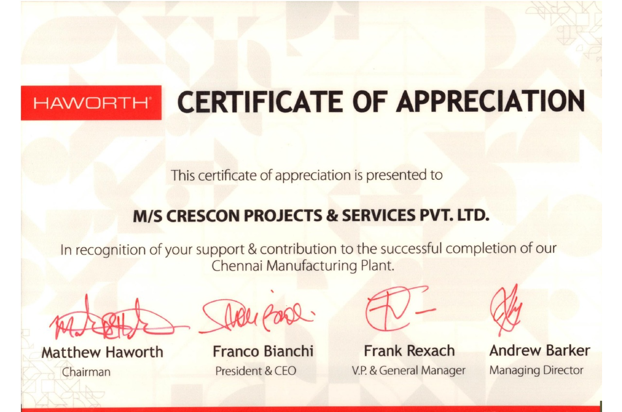 Recognition For Support & Contribution Of Sucessful Completion Of Haworth Chennai Manufacturing Plant