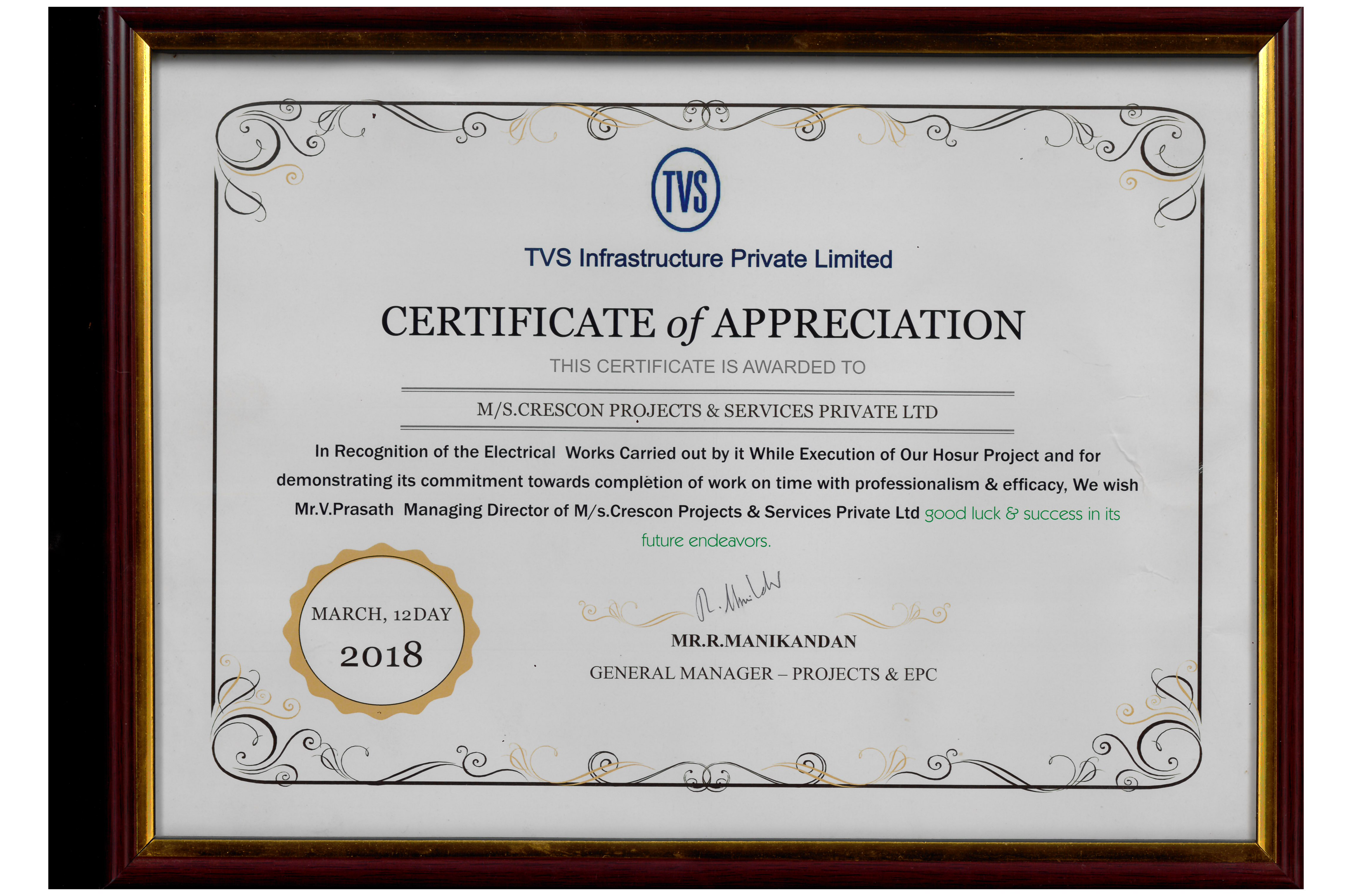 TVS infrastructure in recognition of the electrical works carried out by it while executing of hosur project for demonstrating its commitement of work on time with professionalism and efficacy.